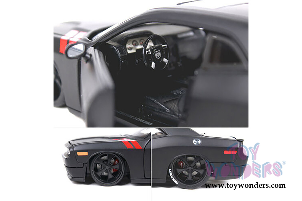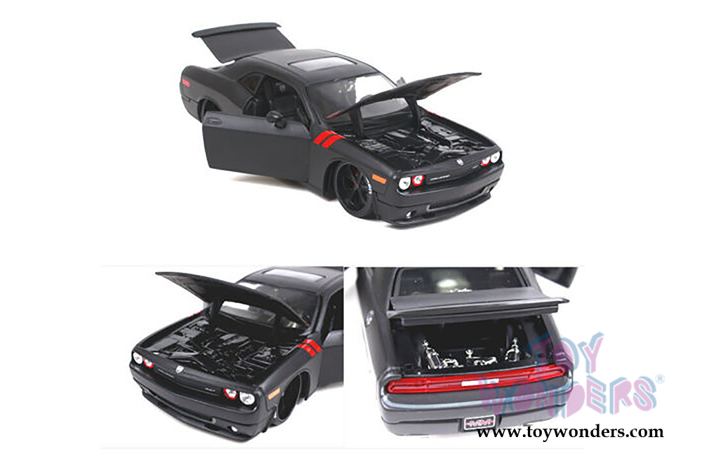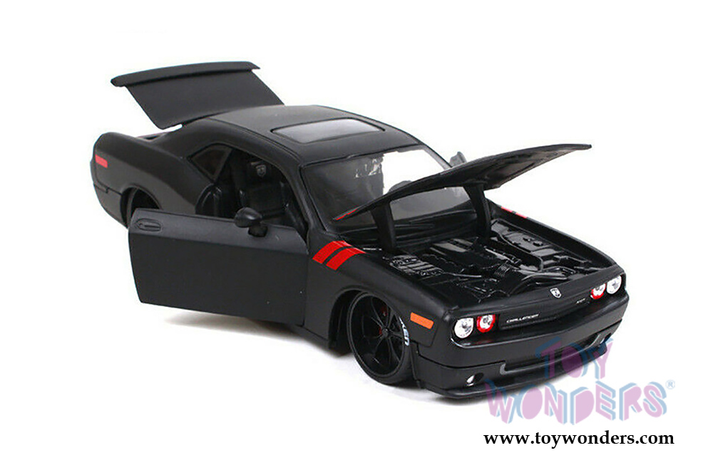 32529BK Maisto Design - Classic Muscle | 2008 Dodge Challenger Hardtop. 1:24 scale diecast collectible model car. This Dodge Challenger is an 8"L x 3.5"W x 2"H diecast metal car with freewheeling, rubber tires, openable doors, trunk, and hood. Each individually packed in a window box. Window Box size is 9.75"L x 5.25"W x 4.5"H. This 2008 Dodge Challenger is manufactured by Maisto. Item 32529BK comes in Matte BLACK.