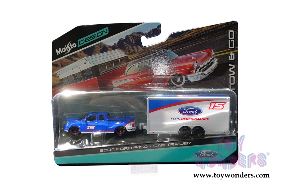 15368F Maisto Design Tow & Go - 2004 Ford F-150 Pickup Truck # 15/Car Trailer #15. 1:64 scale diecast collectible model. Ford F-150 truck is approx. 5" long. Car Trailer is also 5" long diecast metal car. Each set is individually blister carded. Card size: 8.75"W x 6.75"H. 6 pcs/case. Maisto Design Tow and Go set is manufactured by Maisto. Item 15368F Ford F-150 is in BLUE color, Car Trailer also in BLUE with white.