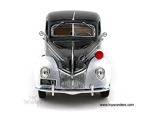31366 MAISTO - 1939 Ford Deluxe State Police. 1:18 scale diecast collectible model car. This 1939 Ford Deluxe Police is a 10"L x 3.5"W x 3"H diecast with openable doors, hood & trunk. Sits on a display plaque. This Ford Deluxe Police is manufactured by Maisto. 31366 is in BLACK color. Individually packed in a window box. Box size: 13"Lx 6.5"Wx 5"H.