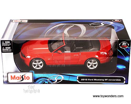 31158 Maisto Special Edition - 2010 Ford Mustang GT Convertible. 1:18 scale diecast collectible model car, This Ford Mustang GT  is a 10"L x 3.5"W x 2.5"H die cast metal car, opening doors, hood & trunk, detailed interior, and sits on a display plaque. Item 31158 is in RED color. Individually packed in a window box. Box size: 13"L x 6.5"W x 5"H.