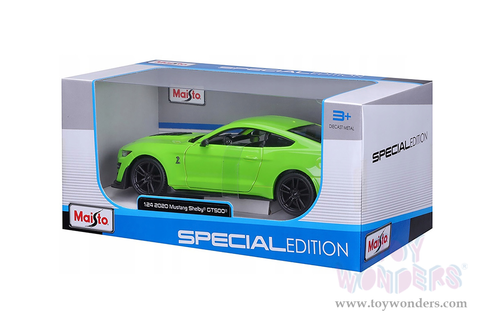 31532GN Maisto - Ford Shelby® GT500® Hardtop. 1:24 scale diecast collectible model car. This Shelby® is a 7.75"L x 3.5"W x 2.25"H diecast metal car with freewheeling, openable doors, and hood. The 2020 Shelby® is manufactured by Maisto. Each individually packed in a window box. Window Box size is 9"L x 4.5"W x 4"H. 31532GN is in Green color with Black stripes.