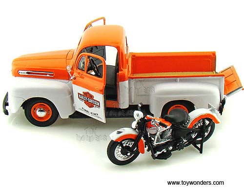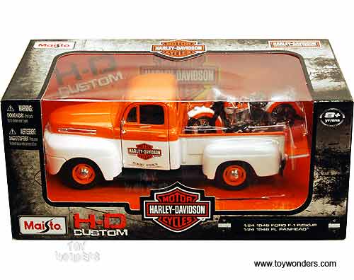 32171 Maisto HD - 1948 Ford F-1 Pickup Harley-Davidson & 1948 FL Panhead Motorcycle. 1:24 scale die-cast collectible models. This 1948 Ford F1 pick-up is a 7.75"Lx 3"Wx 3"H die cast metal plastic with openable doors & tailgate, free wheeling, in ORANGE & WHITE 2-tone colors. The 1948 FL Panhead Motorcycle is 3.5" long, also in ORANGE & WHITE 2-tone colors. They are manufactured by Maisto. Packed in a window box WB, and box size is 9.75"Lx 5.25"Wx 4.5"H.