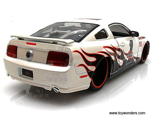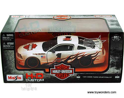 32169 Maisto HD - 2006 Ford Mustang GT Hard Top Harley-Davidson #1. 1:24 scale diecast collectible model car. This Ford Mustang GT is a 7.5"Lx 2.75"Wx 2.25"H die cast metal plastic with openable doors & hood, free wheeling. This 2006 Ford Mustang GT is manufactured by Maisto. Each individually packed in a window box WB, and box size is 9.75"Lx 5.25"Wx 4.5"H. 32169 is in PEARL WHITE color with frames.