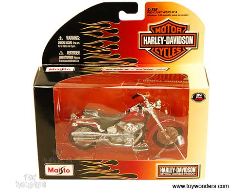 31360/27 Maisto - Harley-Davidson Motorcycles Series 27. 1:18 scale diecast collectible model. These bikes are approximately 5" long and 2.5" high. Die-cast metal, workable steering, workable/detailed suspension, kickstand. These Harley Davidson motor bikes are manufactured by Maisto. Individually pack-able window box. Box size: 7"L x 2.5"W x 7"H. 24 pcs per inner. Assortment includes:
