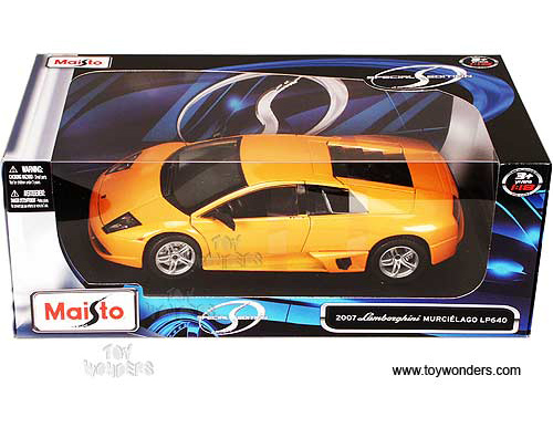 31148OR Maisto Special Edition - 2007 Lamborghini Murcielago LP640 Hardtop. 1:18 scale diecast collectible model car. This Lamborghini Murcielago LP640 is a 9.75"L x 4"W x 2.5"H diecast metal with openable doors, hood, and trunk. Sits on a display plaque. This Lamborghini Murcielago is manufactured by Maisto. 31148OR is in ORANGE color. Individually packed in a window box. Box size: 13"L x 6.5"W x 5"H.