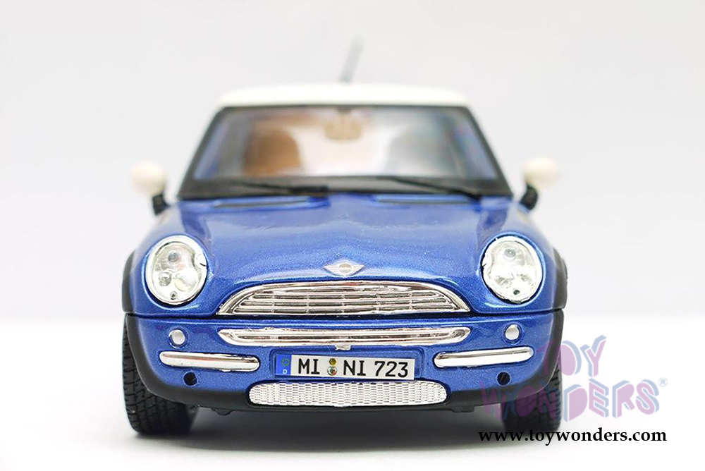 31219BU Maisto - Mini Cooper Hard Top. 1:24 scale diecast collectible model car. This Mini Cooper is a 5.5"L x 2.25"W x 2.25"H die cast metal car with freewheeling, openable hood & doors. Each individually packed in a window box WB, and box size is 9"L x 4.5"W x 4"H. 31219BU is in BLUE color. This Mini Cooper is manufactured by Maisto.