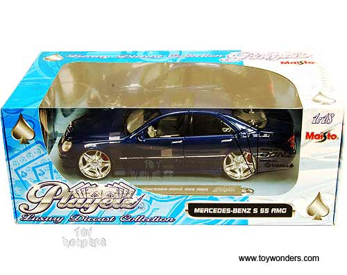 31051BU Maisto Playerz - Mercedes Benz S55 AMG Hard Top w/ Sunroof. 1:18 scale diecast collectible model. This Benz S-55 is a 10.25" long diecast with opening doors/hood/trunk. This Mercedes-Benz is manufactured by Maisto; ref. no. 31051 in BLUE color. Individually packed in a window box.