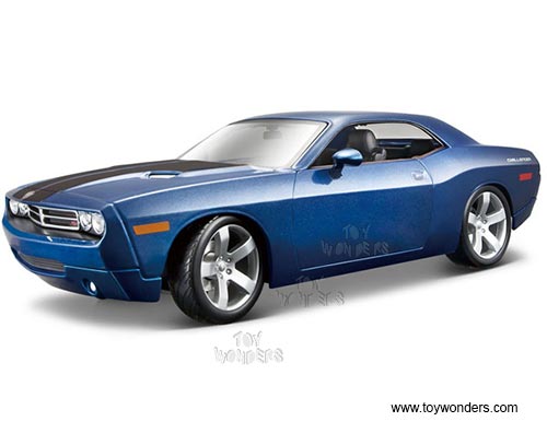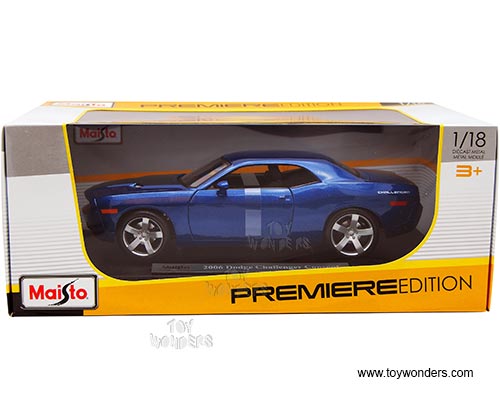 36138BU Maisto Premiere - 2006 Dodge Challenger Concept Hard Top. 1:18 scale diecast collectible model car. This Dodge Challenger is a 10.25"L x 4"W x 2.75"H die cast metal with openable doors, hood & trunk. Sits on a display plaque. This 2006 Dodge Challenger is manufactured by Maisto. Premiere Edition. Individually packed in a window box. Box size: 13.75"L x 7.5"W x 5.5"H. 36138BU is in BLUE color.