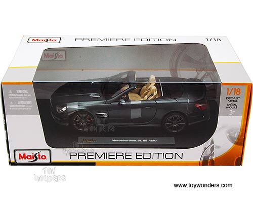 36198 MAISTO Premiere - 2012 Mercedes-Benz SL 65 AMG Convertible. 1:18 scale diecast collectible model car. This Mercedes Benz SL65 AMG is a 9.75"Lx 3.75"Wx 2.5"H die cast metal with open able doors, hood & trunk, workable steering. Sits on a display platform. Premiere Edition. This 2012 Mercedes-Benz SL-65 AMG is manufactured by Maisto. 36198 is in GREY color. Individually packed in a window box. Box size: 13.75"Lx 7.3"Wx 5.5"H.