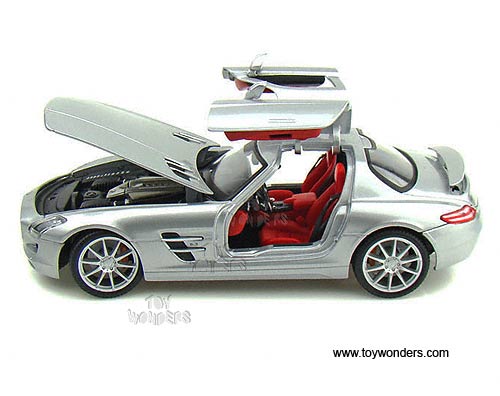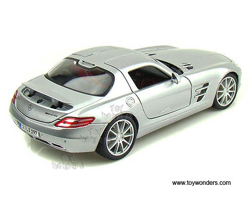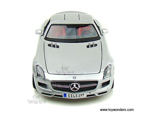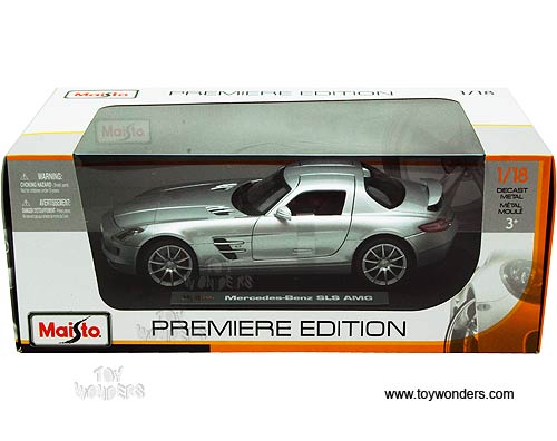 36196 Maisto Premiere - Mercedes-Benz SLS AMG Hard Top. 1:18 scale diecast collectible model car. This Mercedes-Benz SLS AMG is a 9.75"L x 4"W x 2.5"H die cast metal with openable doors & hood. Sits on a display plaque. This Mercedes-Benz SLS AMG is manufactured by Maisto. Premiere Edition. Individually packed in a window box. Box size: 13.75"L x 7.5"W x 5.5"H. 36196 is in SILVER color.