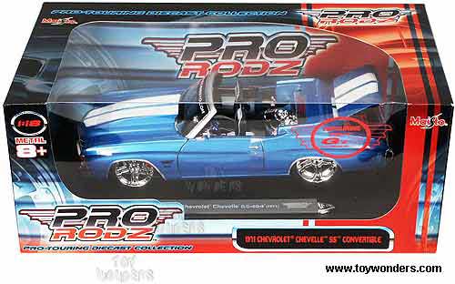 31099BU Maisto Pro Rodz - 1971 Chevrolet Chevelle SS454 Convertible. 1:18 scale diecast collectible model car. This Chevy Chevelle SS-454 is a 10.75"Lx 4"Wx 2.5"H die cast metal car with openable doors, hood & trunk. Detailed engine & components. Sits on a display plaque. This Chevy Chevelle SS 454 is manufactured by Maisto. 31099 in BLUE color with White stripes. Individually packed in a window box. Box size: 13.75"Lx 7.5"Wx 5.5"H. GM is a trademark of the General Motors Corporation.