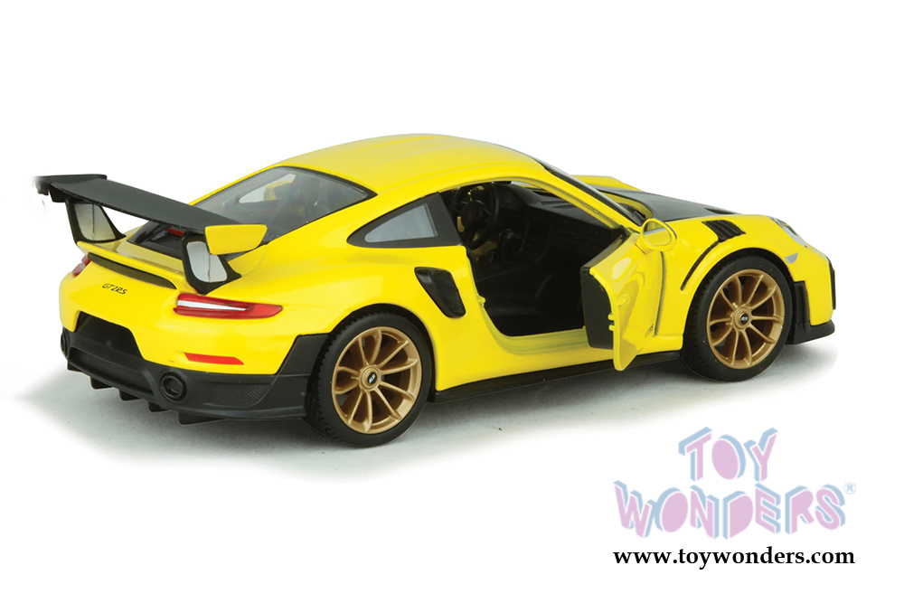 31523YL Maisto - Special Edition | 2018 Porsche 911 GT2 RS Hardtop.  1:24 scale diecast collectible model car. These Porsche are 7.5"L x 3"W x 2.75"H diecast metal car with freewheeling and openable front doors. These Porsches are manufactured by Maisto. Each individually packed in a window box. Window Box size is 9"L x 4.5"W x 4"H. 31523YL is in Yellow.
