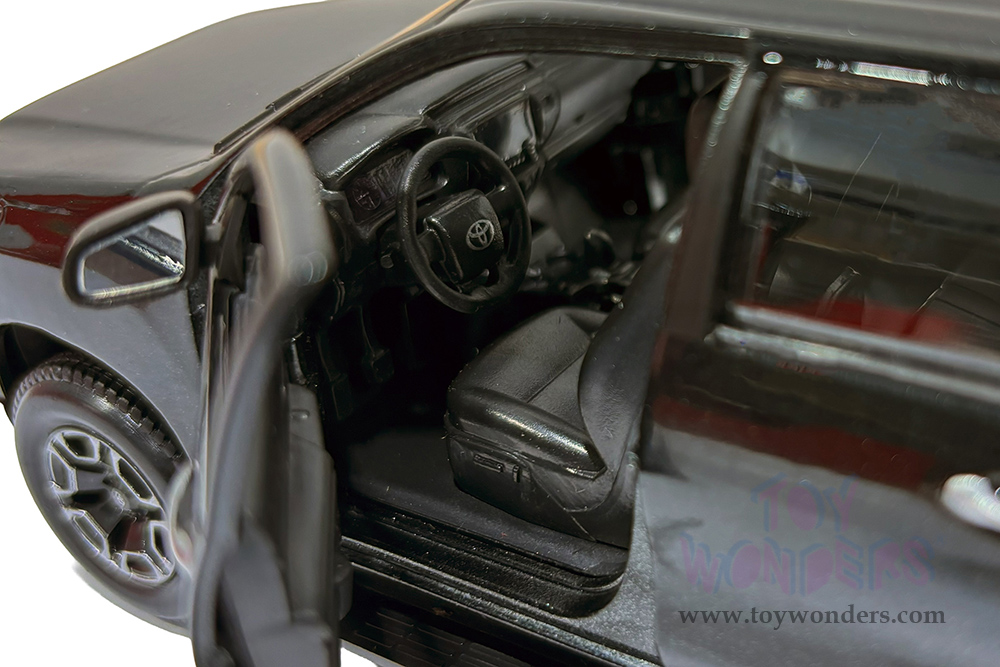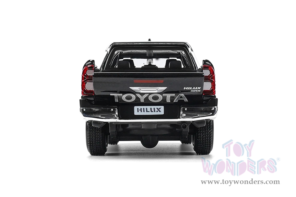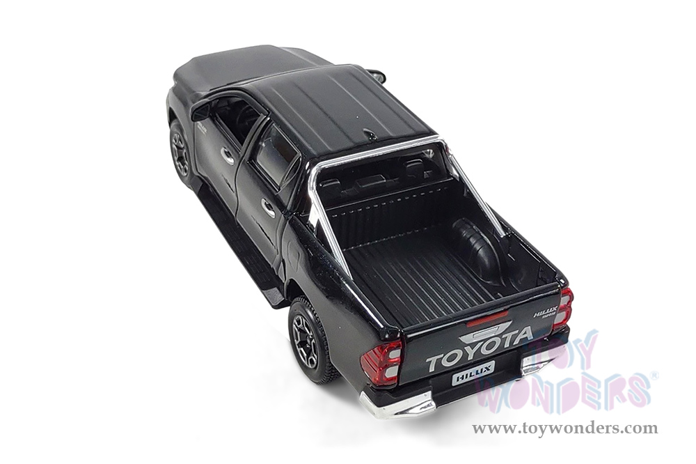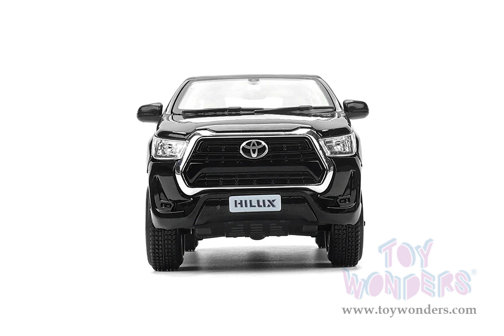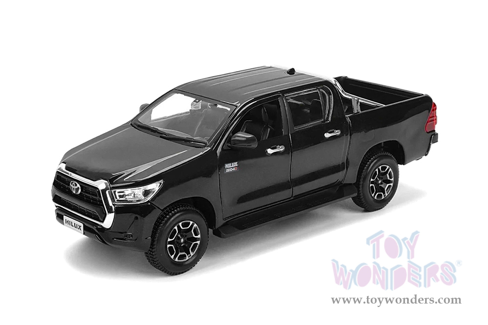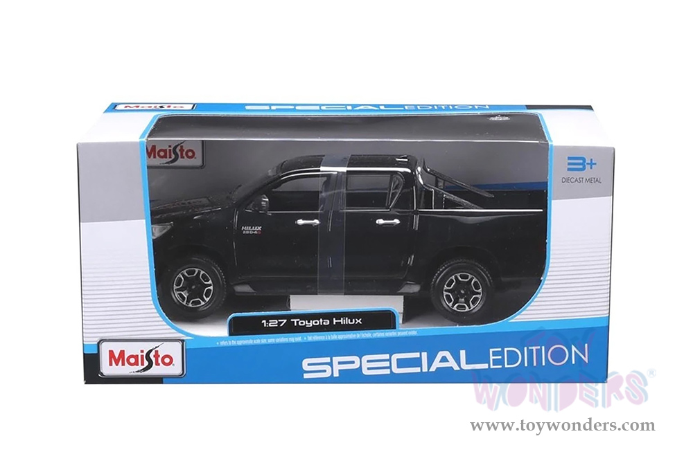32920BK Maisto - Special Edition | Toyota Hilux Double Cab Pickup Truck. 1:27 scale diecast collectible model car. This Toyota Hilux is a 7.75"L x 3"W x 2.5"H diecast metal, free wheeling, openable doors and tailgate. Each individually packed in a window box WB, and box size is 9"Lx 4.5"Wx 4"H. 32920BK is in black. This Toyota Hilux is manufactured by Maisto.