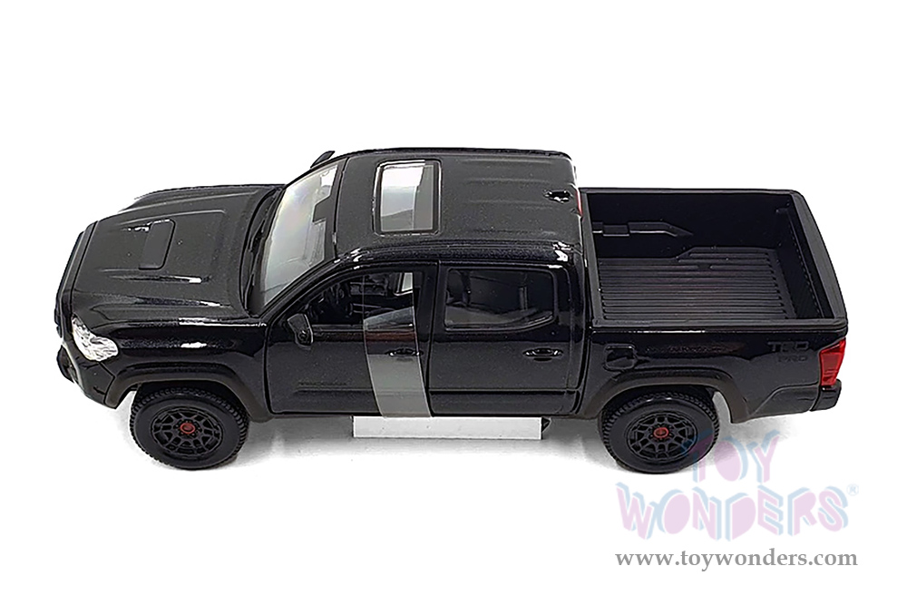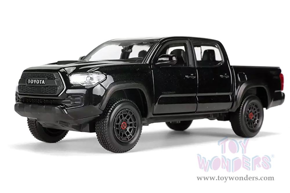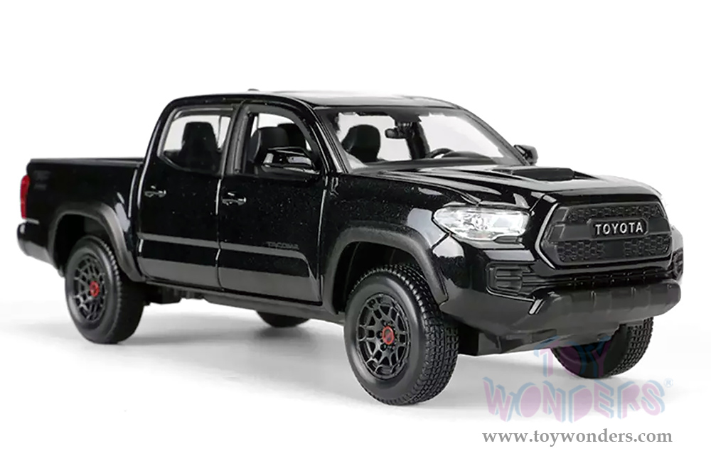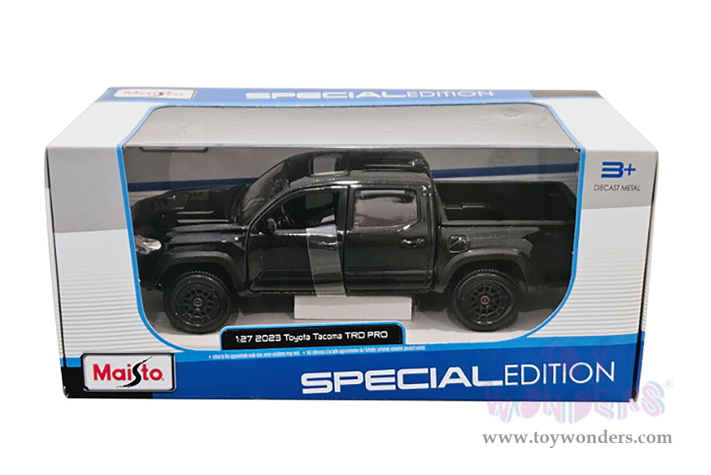 32910BK Maisto - Special Edition | 2023 Toyota Tacoma TRD PRO Pickup Truck. 1:27 scale diecast collectible model car. This Toyota Tacoma is an 8"L x 2.75"W x 2.5"H diecast metal, free wheeling, openable doors and sunroof. Each individually packed in a window box WB, and box size is 9"Lx 4.5"Wx 4"H. 32910BK is in black. This 2023 Toyota Tacoma is manufactured by Maisto.