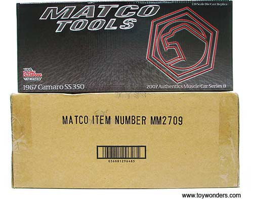 29648R Matco Tools Authentics - 1967 Chevy Camaro SS350 Hard Top. 1:18 scale diecast collectible model car. This Chevrolet Camaro SS-350 die cast metal car features openable hood & doors. Limited Edition (1 of 1200 pcs). This Classic Ertl Authentic car includes a Matco Tools certificate of Authenticity. '07 Authentics muscle car series 8. This 1967 Chevy Camaro SS 350 is manufactured by RC2 Racing Champions American Muscle. Individually clam shell packed in solid Matco box. Box size: 13.75"Lx 6.25"Wx 5.75"H. Then placed into plain shipper box. 29648 in RED color. MM2709. GM is a trademark of the General Motors Corporation.