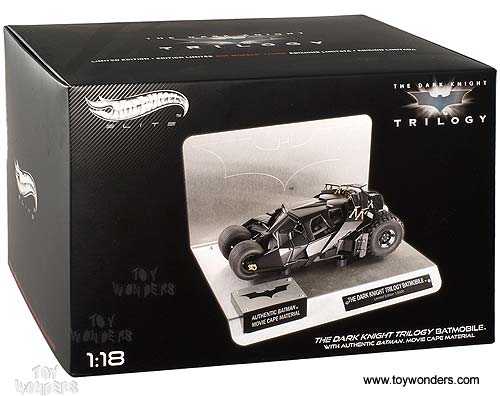 BCJ99 Mattel Hot Wheels Elite Batman - The Dark Knight Trilogy Batmobile with Authentic Batman Movie Cape Material. This Batmobile features a 1:18th scale reproduction of the groundbreaking vehicle used in the films --- the largest BATMOBILE to date. It comes attached to a custom plinth that includes a swatch of authentic BATMAN movie cape material, provided by a special arrangement with Warner Bros. This Batmobile is manufactured by Mattel. Hot Wheels diecast collection. Individually packed in a box. Box size: 11.75"L x 9.5"W x 7.25"H. BCJ99 is in BLACK color. Limited edition 1 of 5000 pcs.