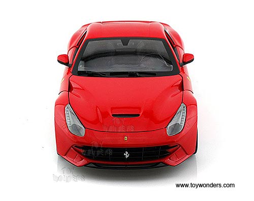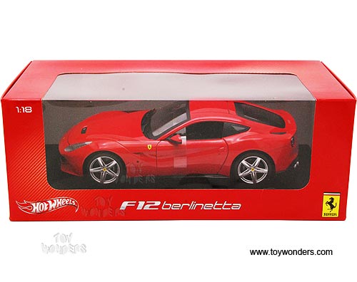 BCJ72 Mattel Hot Wheels - Ferrari F12 Berlinetta Hard Top. 1:18 scale diecast collectible model car. This F-12 Berlinetta is a 10"L x 4"W x 2.75"H die-cast metal car with openable doors. It sits on a display platform. This Ferrari F12 Berlinetta is manufactured by Mattel. Individually packed in a window box. Box size: 13.5"L x 6.75"W x 5"H. BCJ72 is in RED color.