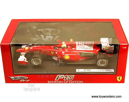 T6288/9964 MATTEL Hot Wheels Racing - 2010 Ferrari F10 Bahrain GP Edition Felipe Massa #7. 1:18 Scale diecast collectible model car. This Ferrari F10 F-1 is an 11.25"L x 4"W x 2.25"H die cast metal racing car. Sits on a display plaque. Sponsored by Bridgestone, Shell, acer, Fiat, Santander, AMD, Etihad Airways, and more. This Ferrari F 1 Formula is manufactured by Mattel. T6288/9964 is in RED color. Individually packed in a window box. Box size: 13.25"L x 6.75"W x 5"H.