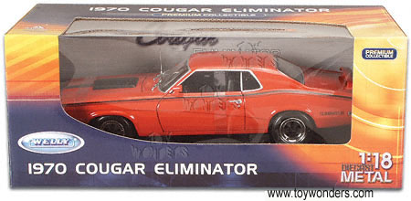 2520OR WELLY. Mercury Cougar Eliminator (1970). 1:18 scale. This 1970 Ford Mercury is a 10"Lx 3.75"Wx 2.5"H diecast car with opening doors/hood. Steerable front wheel. Detail component. Mounted on a display stand. This 70 Ford Mercury is manufactured by Welly. 6 pcs per inner box. Orange color.