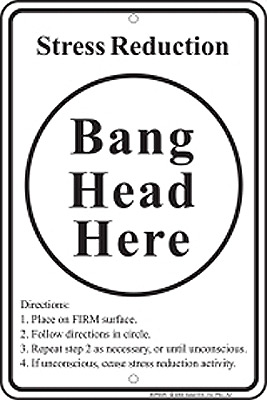 SPSSR Bang Head Here - Stress Reduction metal sign. A collection of yesterday's signs. Great for decorating homes, offices, restaurants, etc. Aluminum metal sign. Size approximately is 8" x 12".