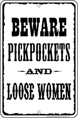 SPSGA2 Beware Pickpockets And Loose Women metal sign. Collector metal signs. A collection of yesterday's signs. Great for decorating homes, offices, restaurants, etc. Aluminum metal sign. Size approximately is 8" x 12".