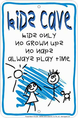 SPSKC Kids Cave metal sign. A collection of yesterday's signs. Great for decorating homes, offices, restaurants, etc. Aluminum metal sign. Size approximately is 8" x 12".