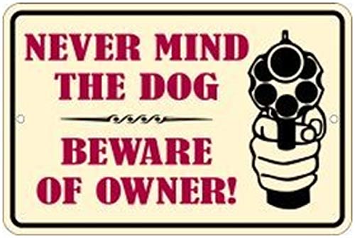 SPSONR Never Mind the Dog - Beware of Owner! metal sign. A collection of yesterday's signs. Great for decorating homes, offices, restaurants, etc. Aluminum metal sign. Size approximately is 12" x 8".