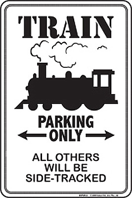 SPSRC2 Train Parking Only metal sign. Locomotive train Collector metal signs. A collection of yesterday's signs. Great for decorating homes, offices, restaurants, etc. Aluminum metal sign. Size approximately is 8" x 12".