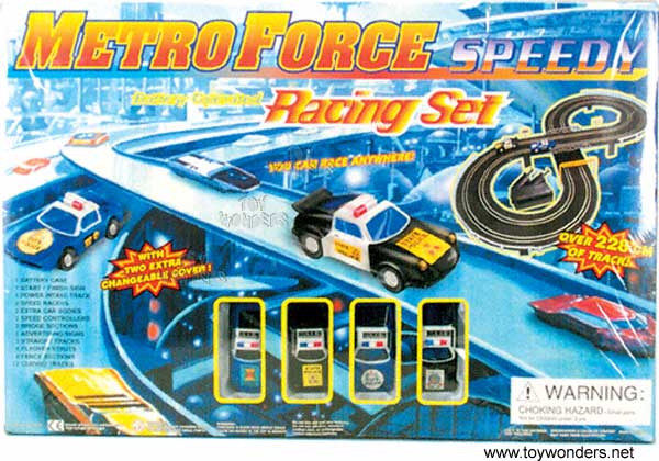 06245P/12 Metro Force Racing Set. Slot car racing set includes signs, tracks, two 3.75" speed racers, 2 extra bodies, speed controllers, bridge sections, struts, and more. Requires 4 "D" batteries. Box size: 25.75"Lx 2"Wx 17"H. Note this set contains no die cast metal vehicles.