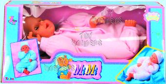 61680 Mi Mi Baby Doll. 15" stuffed bean baby doll. Press its chest it'll say "mama," "papa," laughs or crys. Clothing outfits may vary. "TRY ME" button. Box size: 15.25"Lx7"Wx7"H.