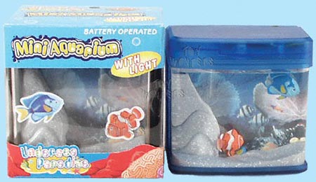 9201L Mini Aquarium. Battery operated lite up aquarium with 2 plastic fish. Aquarium size: 3.75"Lx3.5"Hx2.5"W. Requires 2 "AA" batteries. Box size: 4"Lx4"Hx3"W.