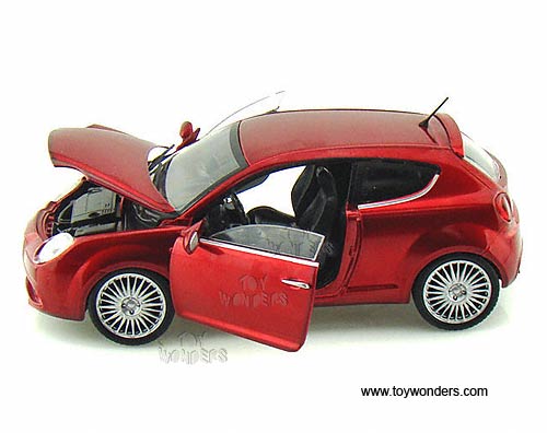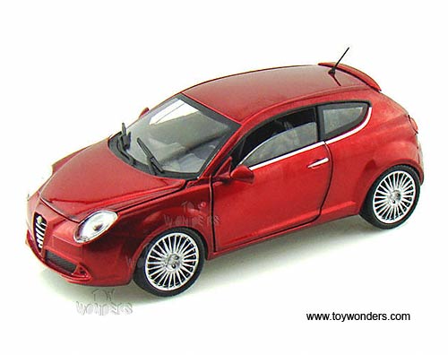 MO51046 Mondo Motors - Alfa Romeo Mito Hardtop. 1:24 scale diecast collectible model car. This Alfa Romeo Mito is a 6.5"Lx 2.75"Wx 2.25"H diecast metal car with openable doors and hood. Italian design. The Alfa Romeo Mito is manufactured by Mondo Motors. MO51046 is in metallic RED color. Individually packed in a window box. Window Box size: 9.5"Lx 5"Wx 4"H.