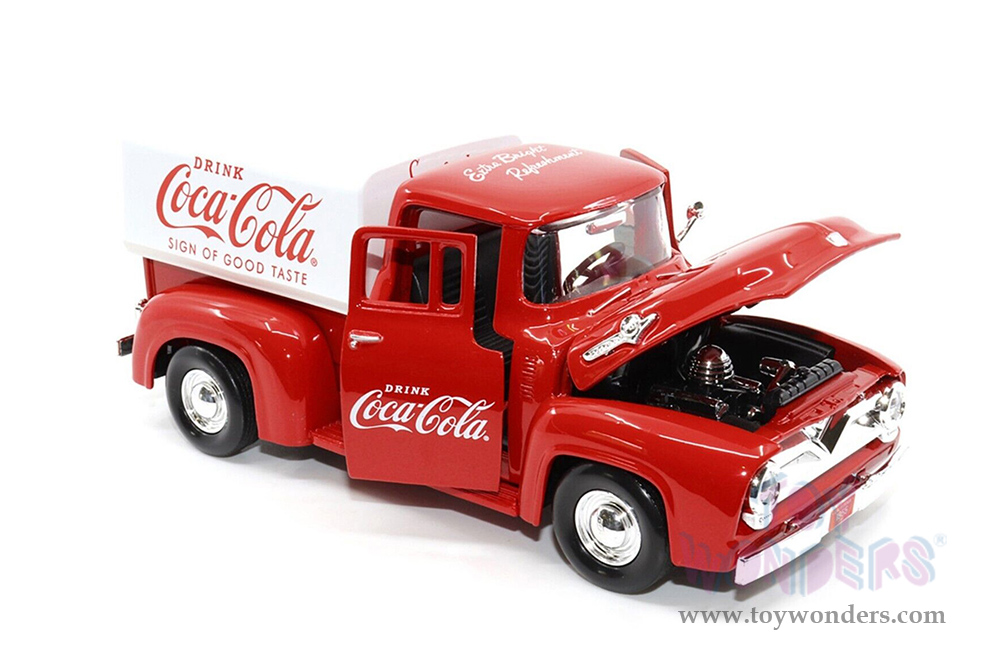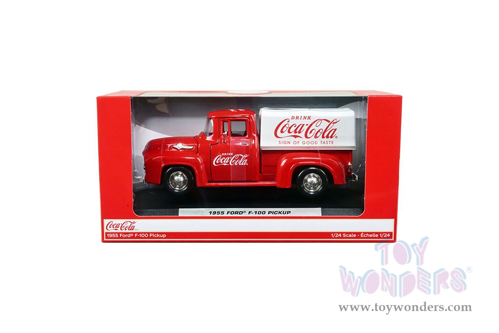 424050 Motor City Coca-Cola - 1955 Ford F-100 Pickup Truck with Canopy. 1:24 scale diecast collectible model car. This Ford pickup is a 7.5"L x 3"W x 3"H diecast metal car. Has openable hood and doors. Highly detailed comes in a window box. Window Box size: 10.25"L x 5"W x 5"H. This Coca-Cola Pickup truck is manufactured by Motor City Classics. Item 424050 comes in RED color with white Canopy.