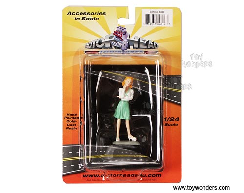 336W Motorhead Miniatures Figurine - 1:24 scale Lady Bonnie in WHITE & GREEN. Hand painted cold-cast resin. This 2.75" figure is great for decorating 1:24 scale cars and dioramas. These figures are manufactured by Motorheads. Individually packed in a blister card. Card size: 5.2" x 7.75". 336