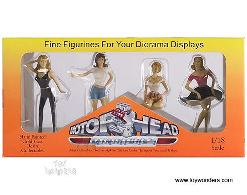950 Motorhead Miniatures Figurines- 1:18 Scale Hot Riders #1 Set of 4. Hand painted cold-cast resin. These figures are great for decorating 1:18 scale cars and dioramas. This set includes four approximately 3.5" lady figures. These figures are manufactured by Motorheads. Packed in a window box. Box size: 10.5"Lx 2.25"Wx 5"H.