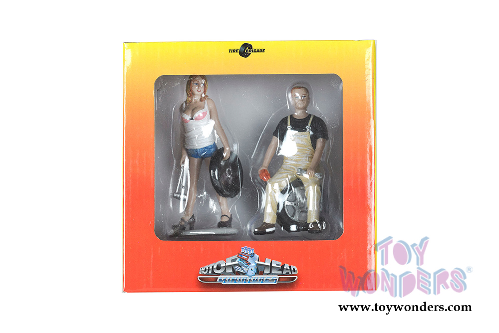 770 Motorhead Miniatures - Tire Brigade Meg and Derek 2-piece Figurine Set. Hand painted 1:18 scale models. They are great for decorating 1/18 scale cars and dioramas. This set includes Meg and Derek, both 3.5" tall. Manufactured by Motorhead. Figurine set packed in a Box. Box size: 6"L x 6"W x 3.25"H. 12 sets per inner.