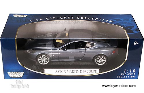 73174BU Motormax - 2006 Aston Martin DB9 Coupe. 1:18 scale diecast collectible model car. This Aston-Martin DB-9 is a 10"Lx 3.75"Wx 2.75"H die cast metal car with steerable front wheels, openable doors & hood. It sits on a display plaque. This Aston Martin DB9 is manufactured by Motor Max. Individually packed in a window box. Box size: 14.25"Lx 6.25"Wx 4.75"H. Item 73174 is in BLUE color.