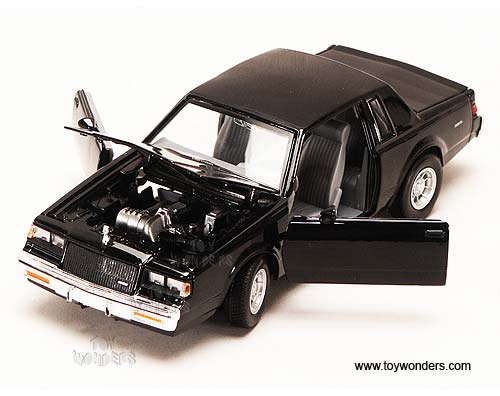 73319BK MOTORMAX - 1987 Buick Regal Hard Top. 1:24 scale diecast collectible model car. This Buick Regal is 8.5" long x 3"W x 2"H die cast metal plastic with openable hood & doors, free wheeling. Manufactured by Motor Max Toys. Each individually packed in a window box WB, and box size is 9.75"Lx4.3"Wx4"H. 73319 in BLACK color. GM is a trademark of the General Motors Corporation.