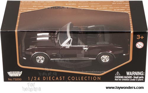 73301BG MOTORMAX - 1967 Chevrolet Camaro SS Convertible. 1:24 scale diecast collectible model car. This Chevy Camaro is a 7.25"Lx 2.75"Wx 1.75"H die cast metal car with openable doors, hood & trunk, free wheeling. The Chevy Camaro is manufactured by Motor Max Toys. Each individually packed in a window box WB, and box size is 9.75"Lx 4.3"Wx 4"H. 73301 in BURGUNDY color. GM is a trademark of the General Motors Corporation.