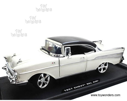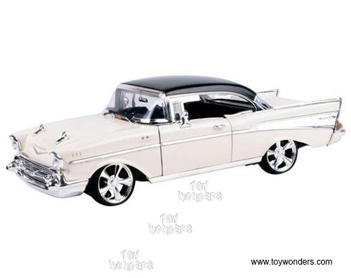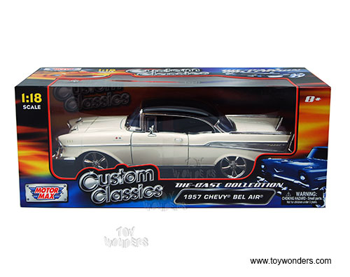 79006CM Motormax Custom Classics - 1957 Chevrolet Bel Air Hard Top. 1:18 scale diecast collectible model car. This 1957 Chevy Bel Air measures 11"L x 4"W x 3.25"H diecast classic car with steerable front wheels, openable doors, and hood. Detailed engine and interior. Sits on a display plaque. This 1957 Chevy Bel Air is manufactured by Motor Max. Item 79006CM is in CREAM with Black roof. Individually packed in a window box. Window Box size: 14"L x 6.25"W x 5.5"H. GM is a trademark of the General Motors Corporation.