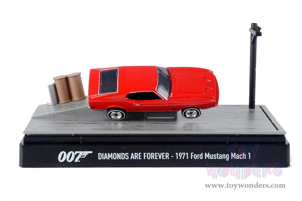 79824 Motormax Dioramas - 1971 Ford Mustang Mach 1 James Bond 007 "Diamonds are Forever" (1971) Movie. 1:64 scale diecast collectible model car with some plastic parts. This Mustang is a 3" long die cast metal car. Does not have any openings. Authentic James Bond scenery & base makes for a realistic 007 Showpiece. The Ford Mustang is manufactured by Motor Max Toys. Comes in plastic display showcase. Box size: 6"Lx 3"Wx 3"H. 79824 is in red.