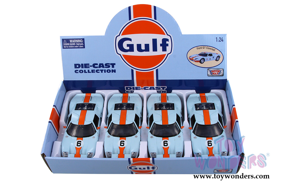 Scale: 1:24 This Ford GT Concept #6 Gulf Oil is a 7.5"L x 3"W x 1.75"H diecast collectible classic car with openable doors. Manufactured by Motor Max Toys. 4 pcs per display box. Light BLUE and ORANGE color.