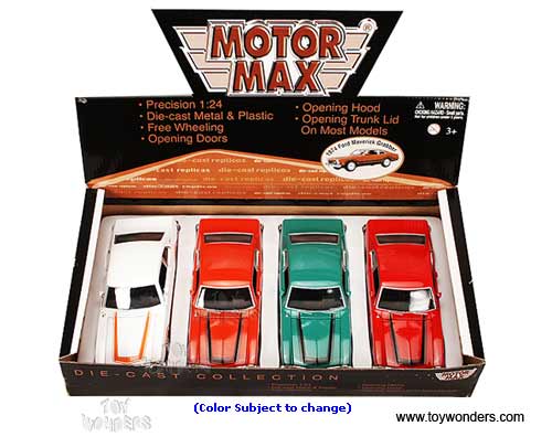 73326ED MOTORMAX - 1974 Ford Maverick Grabber Hard Top. 1:24 scale diecast collectible model car. This Ford Maverick Grabber is a 7.5"Lx 3"Wx 2.25"H die cast metal plastic with openable doors & hood, free wheeling. This Ford Maverick Grabber is manufactured by Motor Max Toys. 4 pcs per display box in assorted colors. 16 pcs per inner box.