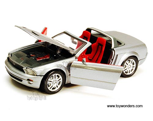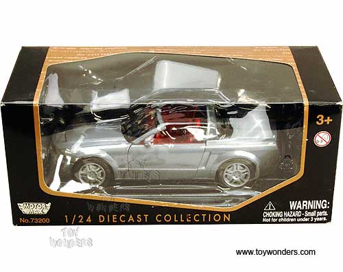 73256GY/6 Motormax - 2004 Ford Mustang GT Concept Convertible. 1:24 scale diecast collectible model car. This Ford Mustang is a 7.5"L x 3.25"W x 1.75"H diecast metal car with free wheeling, steerable front wheels, and openable doors & hood. Individually packed in a window box WB. Box measures 9.75"L x 4"W x 4"H. Manufactured by Motor Max Toys. 73256 in GREY color.