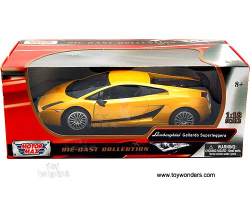 73181YL/4 Motormax - Lamborghini Gallardo Superleggera Hardtop. 1:18 scale diecast collectible model car. This Lamborghini Gallardo Superleggera is a 9.25"L x 3.75"W x 2.25"H diecast metal car with steerable front wheels, openable doors, and trunk. It sits on a display plaque. This Lamborghini Gallardo Superleggera is manufactured by Motor Max. Individually packed in a window box. Window Box size: 12"L x 6.25"W x 4.75"H. 73181YL/4 is in YELLOW color.
