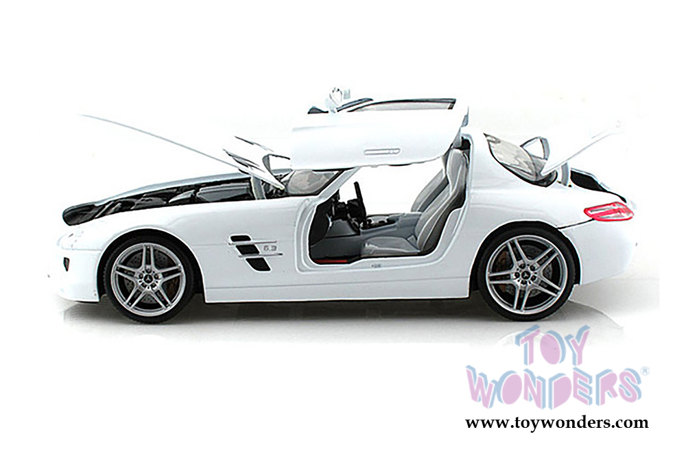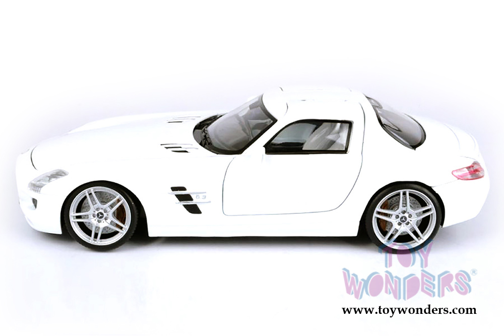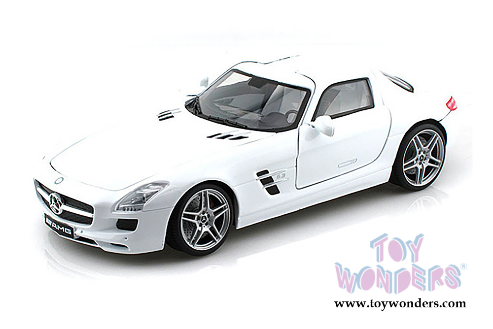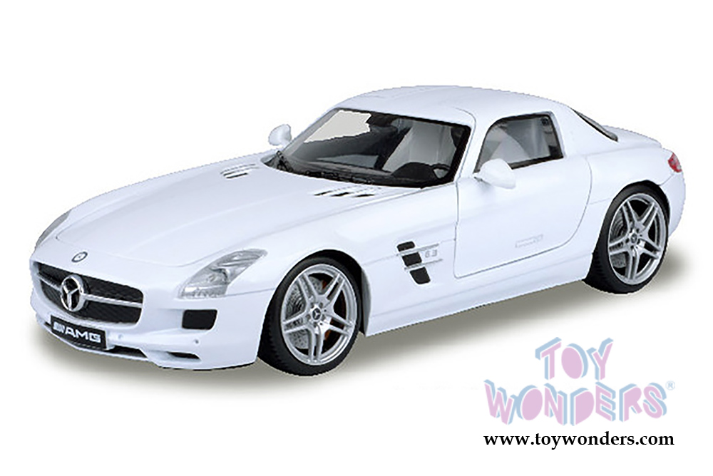 79162W Motormax - Mercedes-Benz SLS AMG Hardtop. 1:18 scale diecast collectible model car. This Mercedes-Benz SLS AMG is a 9.75"L x 4"W x 2.5"H diecast metal car with gullwing doors, openable hood and trunk. Sits on a display plaque. Individually packed in a window box. Box size: 12"L x 6.25"W x 4.75"H. 79162W is in WHITE. This Mercedes-Benz SLS AMG is manufactured by Motor Max.