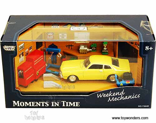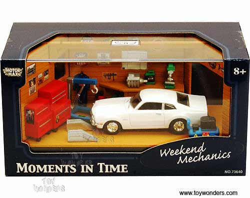 Motormax Moments In Time - Weekend Mechanics Diorama w/ Ford Maverick (1970, 1/64 scale diecast model car, Asstd.) 73644
