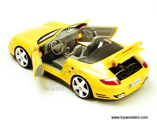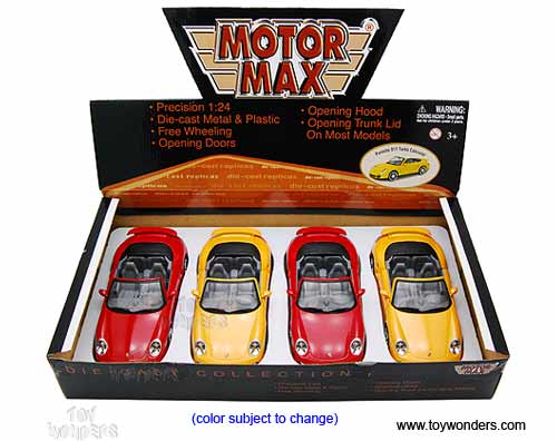 73348/16D Motormax - Porsche 911 Turbo Cabriolet Convertible. 1:24 scale diecast collectible model car. This Porsche 911 Turbo Cabriolet is a 7"L x 3"W x 2"H die-cast metal car with openable doors & trunk, free wheel and workable steering. This Porsche 911 Turbo Cabriolet is manufactured by Motormax. 4 pcs per display box in assorted colors.