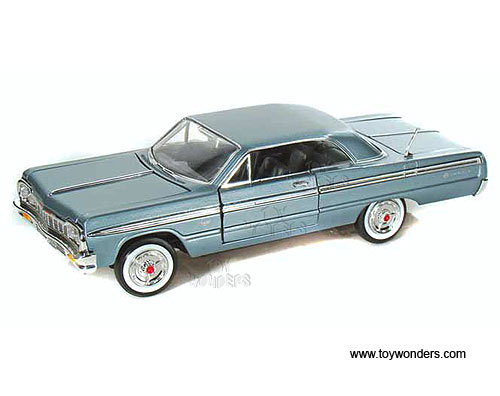 73259AC/BU Motormax Premium American - 1964 Chevrolet Impala Hardtop. 1:24 scale diecast collectible model car. This Chevy Impala is an 8.5"Lx 3"Wx 2.25"H diecast metal car with freewheeling, steerable front wheels, openable doors, hood and trunk. Individually packed in a window box. Window Box measures 9.75"Lx 4.5"Wx 4"H. The Chevy Impala is manufactured by Motor Max Toys. 73259AC/BU in BLUE color. GM is a trademark of the General Motors Corporation.