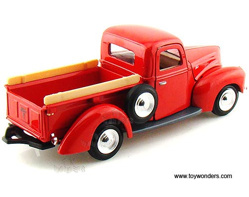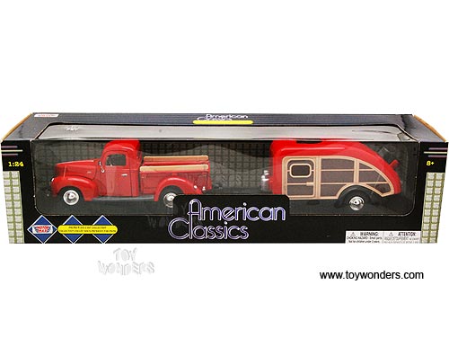 75200 Motormax Premium American Classics - 1940 Ford Pick Up truck with Tear Drop Trailer. 1:24 scale diecast collectible model car. This 1940 Ford is a 7.5"L x 3"W x 3"H diecast metal pickup truck with opening doors/hood and workable steering. This 1940 Ford pick-up truck is manufactured by Motormax. 75200 is in RED color. Packed in a window box WB. Box size: 19.25"Lx 5.75"Wx 4.75"H.